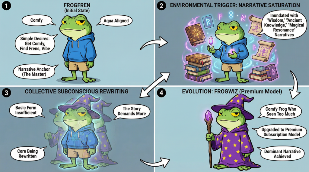 Let’s take our Frogfren, for instance. He’s a Comfy type, aligned with Aqua. Simple desires: get comfy, find frens, vibe. His eventual evolution into a Frogwiz isn’t some magical coming-of-age. It’s an environmental trigger. The Frogfren is saturated in enough ‘wisdom,’ ‘ancient knowledge,’ and ‘magical resonance’ narratives—the steady stream of images showing him reading dusty tomes, casting spells, looking thoughtful—that the collective subconscious begins to rewrite him. The comfy frog who has seen too much. His basic form is now insufficient for the story being told about him. So, he changes. He’s upgraded, you might say, to a Premium subscription model of himself.
