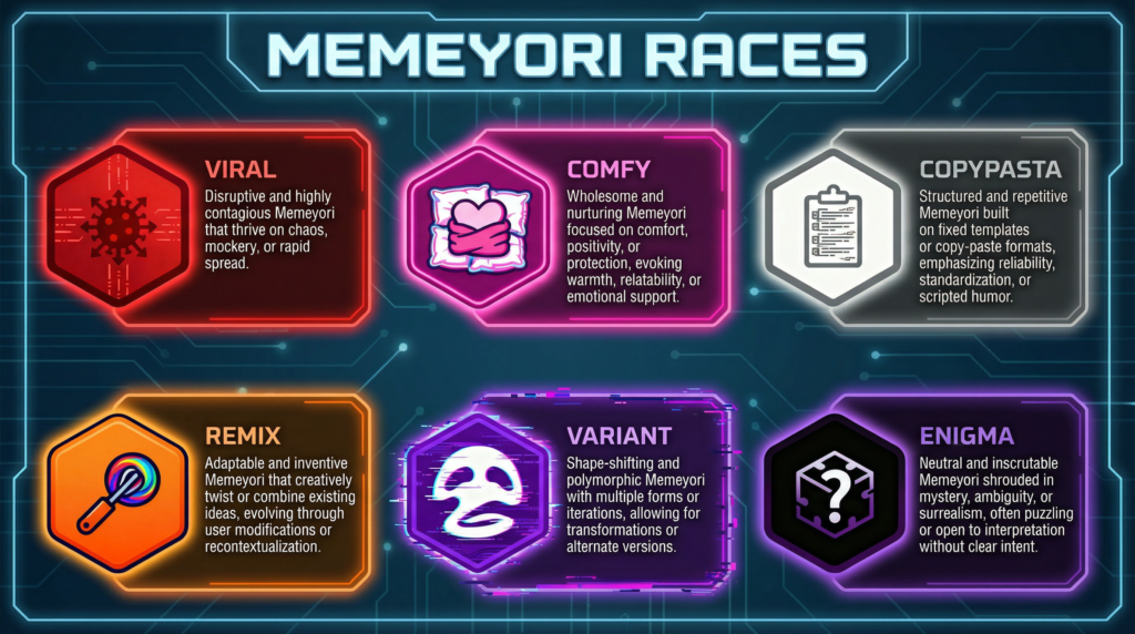 The race of a Memeyori is really their origin story. Viral entities are self-replicating; their core narrative is “spread me,” making them the internet’s version of an infectious disease. Comfy ones spread through positive emotional reinforcement, the digital equivalent of a warm blanket. Copypastas are hardcoded for repetition, their very being a literal block of text. Variants are malleable, shaped by the endless reinterpretations of their base image. Remixes are collisions, born from two or more ideas being mashed together into a new, unstable whole. Enigmas are, as the name implies, narratively opaque. They operate on logic we struggle to parse, because their origin is a pure feeling, a specific shade of melancholy or mania that doesn’t translate into a simple image macro. And Archons… they are not born. They are. They are the settings, the genre conventions, the very operating system of reality made manifest. They don’t follow memes; they dictate the terms of their existence.