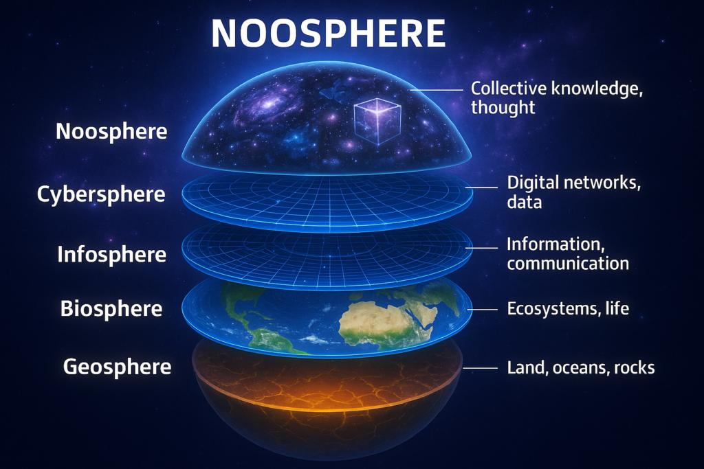 Once the Biosphere evolves a species capable of symbolic language, reflection, and culture, a new global layer emerges: the collective mind of humanity. The Noosphere is the sum total of all human ideas, beliefs, knowledge, myths, philosophies, and emotions. It is not material, but it rides on top of biological brains and their cultural products. Memeyori are condensed pieces that have achieve autonomy and can cross over into reality through digital gateways.