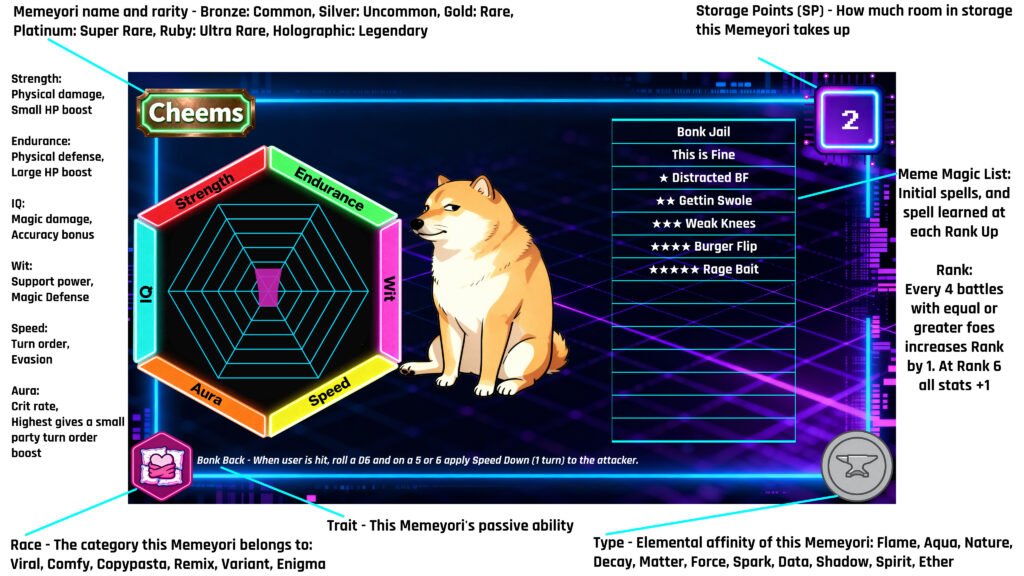Each Type, except Ether, as strengths and weaknesses. If a Memeyori is hit by an attack type they are weak to they take 50% more damage, and if they are hit by an attack type they are strong against they take 50% less damage. In addition, if a Memeyori uses a card with the same type as it the damage is increased by 20%. This is called Same Type Attack Bonus (STAB).