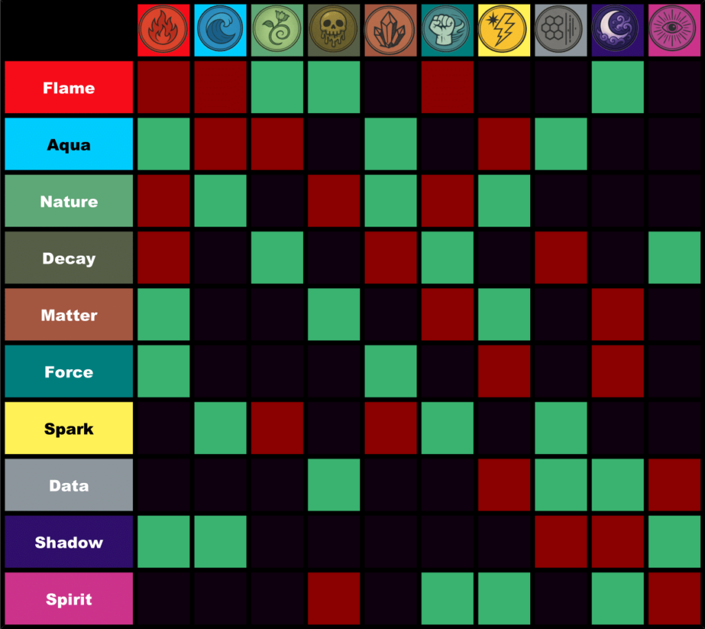 Below is a type chart that lists the strengths and weaknesses of each Type. On the left is the attacker and on the top is the defender. Green means the defending Type is weak to that Type. Red means the defending Type is strong against that Type.